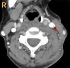 | 图 5 术后颈部增强CT示左侧颈内静脉局部增粗 |