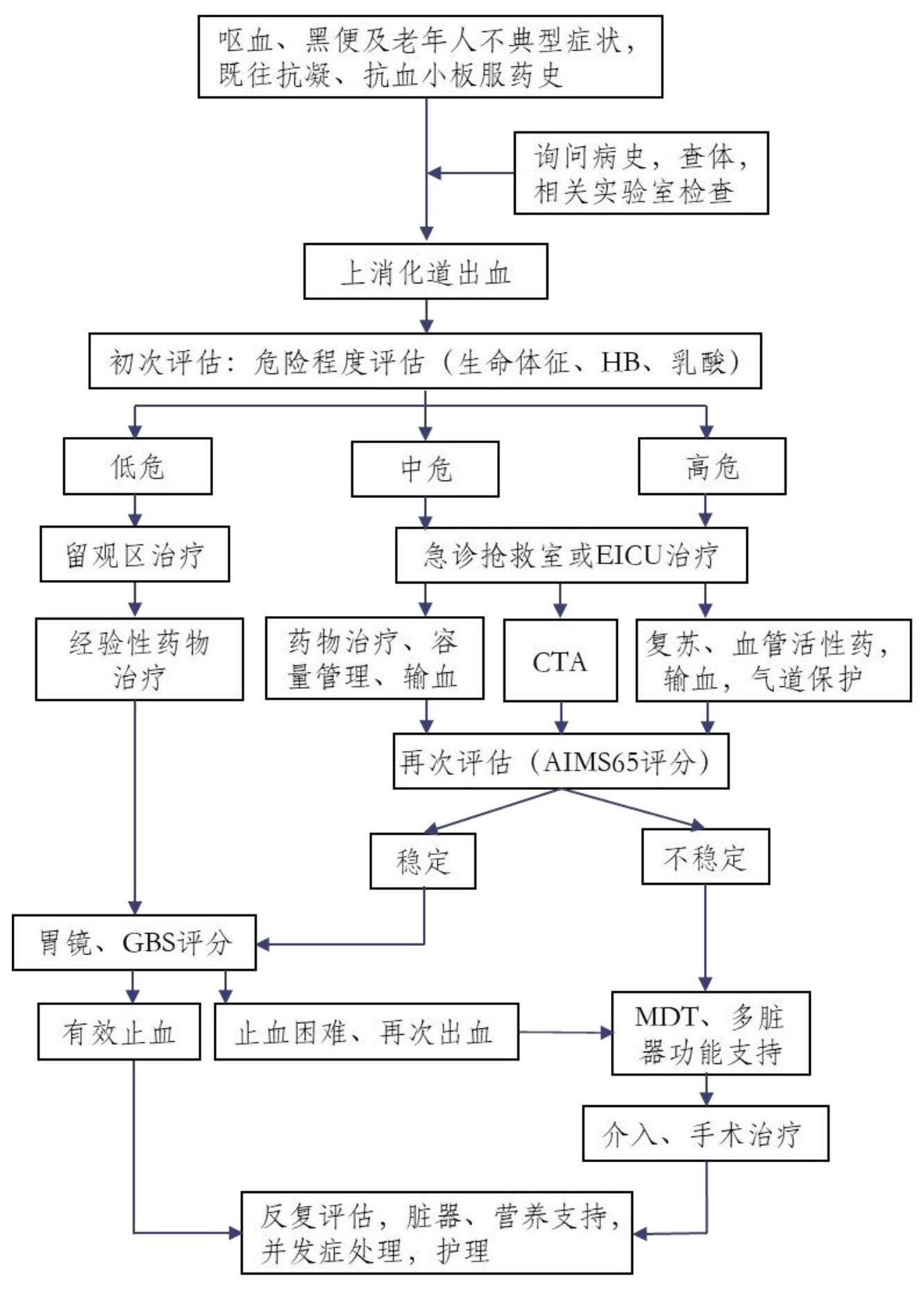 | 高危 | 心率 > 120次/min,MAP < 65 mmHg,昏迷,皮肤花斑,毛细血管再充盈时间 > 4 s,短时间内反复呕血或便血 | 动脉血乳酸 > 4 mmol/L,血红蛋白 < 70 g/L或较原基础下降 > 30 g/L | 积极复苏、使用血管活性药,紧急输血,气道保护,10 min再次评估生命体征,3 h复查实验室检查 |