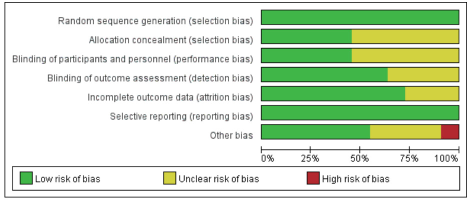在所纳入研究中,11篇文献报告采用随机分组序列的方法,文献的方法学描述比较清晰,无选择性报告结果,且均提供了完整的研究数据。总体来看,纳入的随机对照试验方法学质量大多为中高等。见图 2