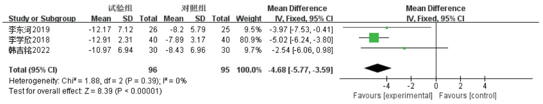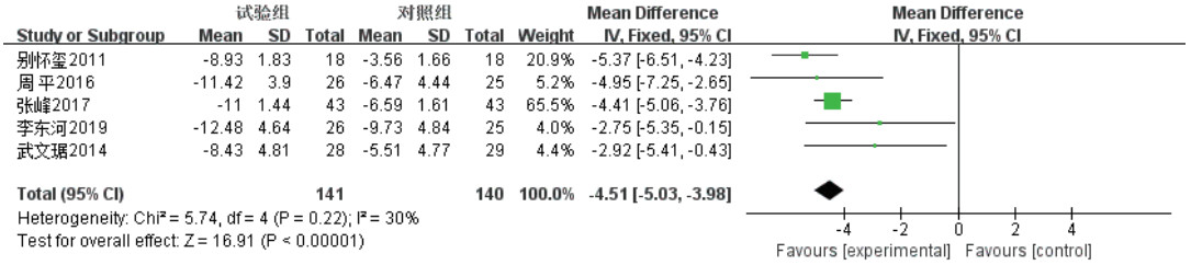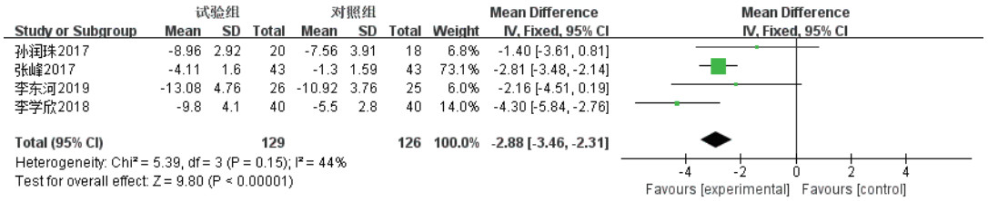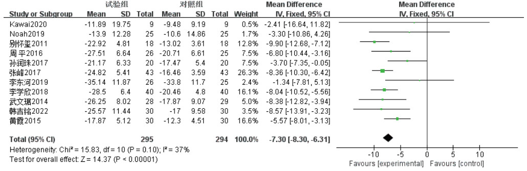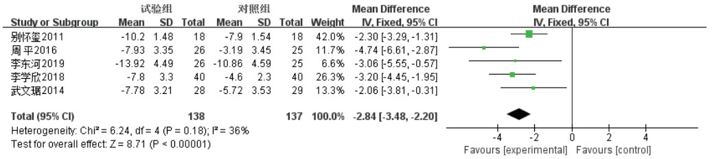 运用Review Manager 5.3来进行分析。各研究的异质性采用I2检验估计,当P>0.1或I2<50%,说明异质性较低,选用固定效应模型进行分析,反之则选用随机效应模型。计量资料采用均数差作为效应统计量,以95%的置信区间(95%CI)表达,以P < 0.05为差异有显著性意义。