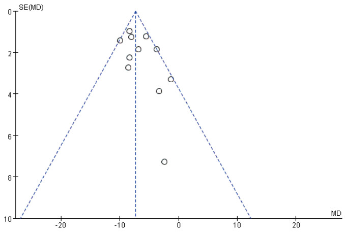 来自11个研究(共599例患者)的数据分析显示,I2<50%,说明异质性较低,采用固定效应模型比较重复经颅磁刺激联合选择性5-羟色胺再摄取抑制剂组(n= 295)和单纯选择性5-羟色胺再摄取抑制剂(n=294)干预后PCL评分总分改善的效果。结果显示[MD=-7.30,95%CI (-8.31,-6.31),P < 0.00001],P<0.05。在PCL评分总分差的森林图中,合并效应量位于无效线左侧,且不与无效线相交,可认为重复经颅磁刺激联合SSRIs治疗组的PCL评分总分改善的效果显著高于SSRIs治疗组,差异有统计学意义,见图 3