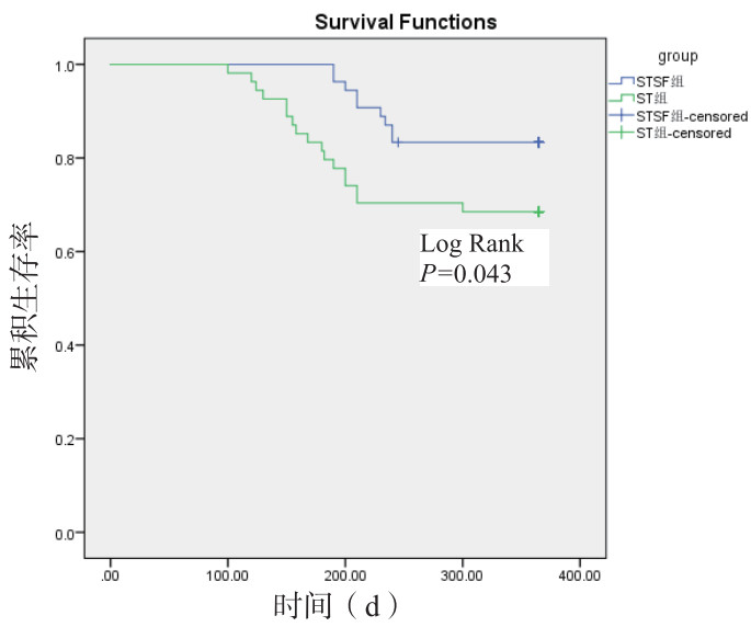 以房颤复发为事件终点采用Kaplan-Meier法绘制窦性心律维持时间曲线。两组均随访1年,均无失访,观察组窦性心律维持时间(337.94±57.96)d,明显高于对照组窦性心律维持时间(304.29±93.95)d(Log Rank P =0.043),见图 1