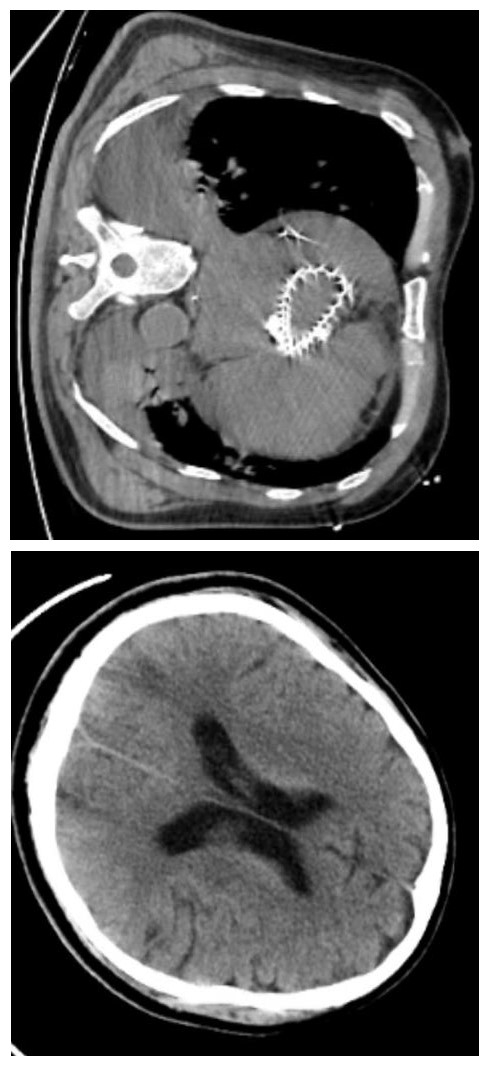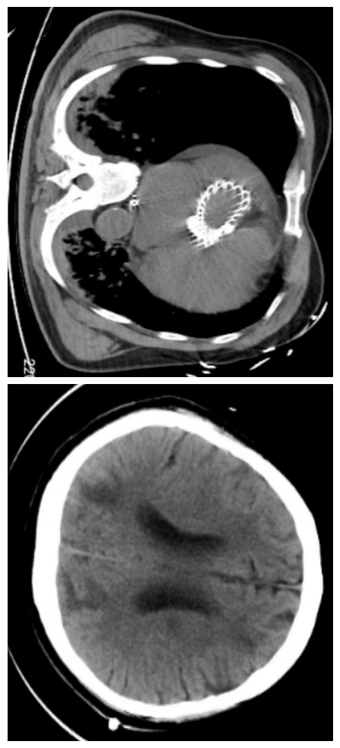 | 图 1 10月10日患者术后肺部及头颅CT |