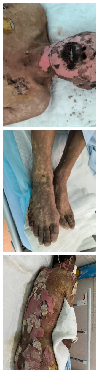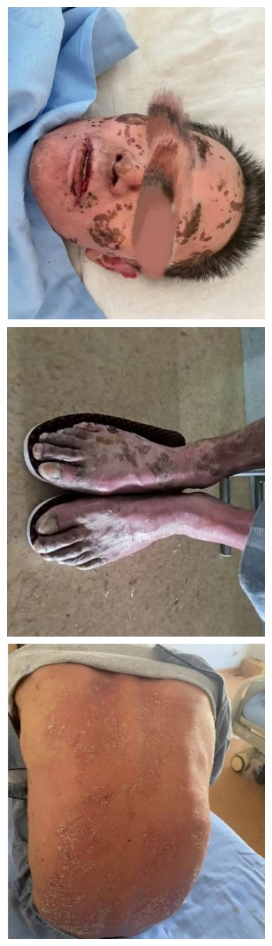 急诊门诊PE:T: 36.8℃,P: 84次/min,BP: 117/65 mmHg,R: 20次/min,贫血貌,双眼睑皮肤破溃、脓性结痂,唇部及唇周皮肤糜烂结痂、伴脓性渗出及张口困难,口腔黏膜可见散在血疱,面部、躯干及四肢皮肤可见散在及密集分布的红斑,后背部可见大面积表皮剥脱,阴囊及外阴可见硬币大小的糜烂面,均明显压痛(见图 1)。辅助检查:血常规提示白细胞10.8×109/L,中性粒细胞比率0.78%,红细胞3.85×1012/L,C-反应蛋白19.78 mg/L;速检生化全项提示钠126.3 mol/L,氯96.3 mmol/L;凝血功能提示D-二聚体8.79 μg/mL,纤维蛋白原降解产物17.77 μg/mL,血沉64 mm/h。为系统诊治,以“SJS”收住兰州大学第二医院急诊内科病房。无其他慢性病史及药物接触史。