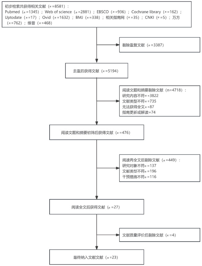2 结果 2.1 纳入文献的一般特征共检索到8 581篇文献,其中PubMed 1 345篇、Web of science 2 881篇、EBSCO 936篇、Cochrane library 162篇、UpToDate 17篇;Ovid 1 632篇、BMJ 338篇、相关指南网35篇、CNKI 5篇、万方762篇、维普468篇。筛选流程见流程图 1。最终纳入23篇相关文献(表 1),其中指南9篇[9-17]、专家共识3篇[18, 19-20]、系统评价11篇[21-31]。
