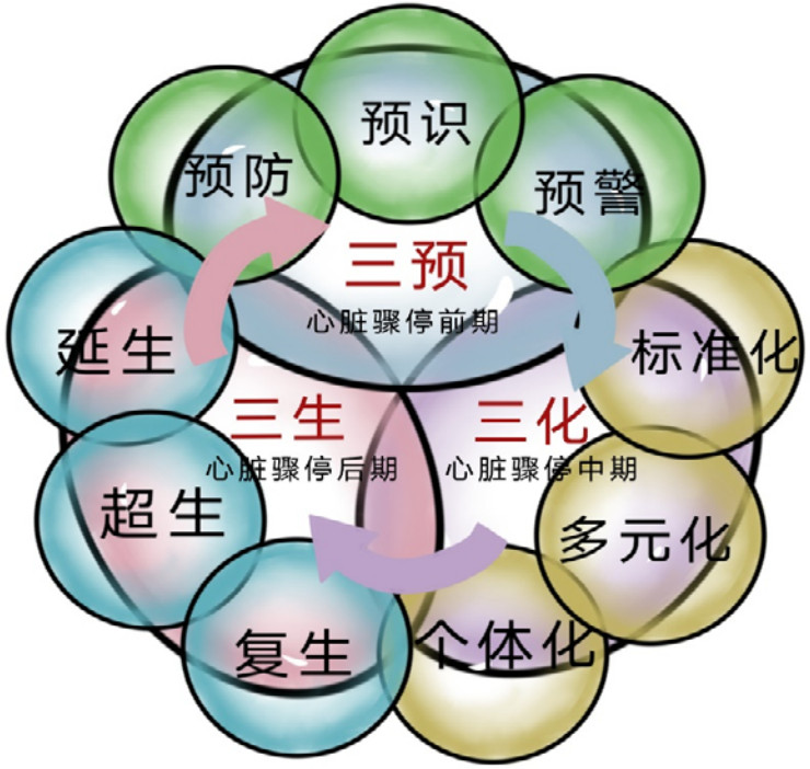 《2016中国心肺复苏专家共识》提出的以心脏骤停为基点三期理论,即心脏骤停前期、中期、后期;提出不同期间主要任务与解决方案,并分别构成三个环,即心脏骤停前期“三预”环(预防、预识、预警);心脏骤停中期“三化”环(标准化、多元化、个体化),心脏骤停后期“三生”环(复生、超生、延生),三个环相互相连,相互重叠,相互循环,并形成一个心肺复苏生存环(图 1[9-10]