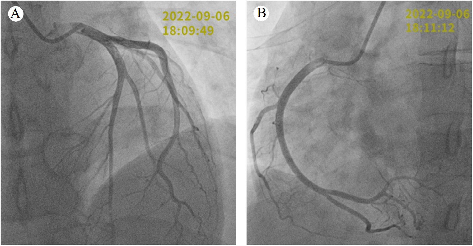 | 注:A为左冠状动脉造影;B为右冠状动脉造影 图 2 9月6日患者冠状动脉造影结果 |