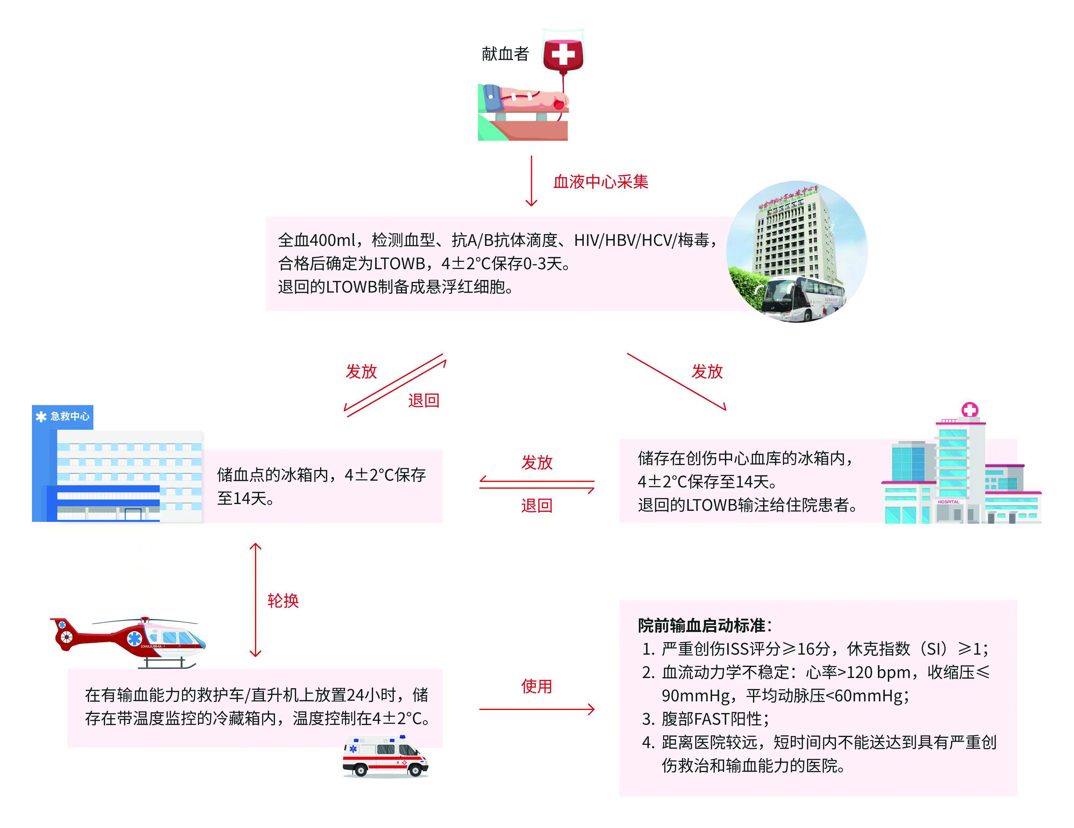 在我国,目前还未能实现在院前急救工作中常规为严重创伤患者及时实施输血治疗,只有少许个案院前应用或应急演习的相关报道[20-21]。2022年,国家科技部设立《伤员出血现场快速识别与止血关键技术研究》重点研发计划专项,重点研究解决灾害事故伤员出血严重程度的早期快速识别与现场处置[22];2024年,为推动我国严重创伤紧急救治血液保障和输血策略的改进,中华医学会临床输血学分会等发布了《严重创伤患者紧急救治血液保障模式与输血策略中国专家共识(2024)》,推荐建立院前急救血液保障机制,将院前输血作为严重创伤院前救治的重要组成部分[23],建议院前急救输血采用通用型血液保障模式,院前转运平台可携带LTOWB,或者O型悬浮红细胞+解冻后AB型/A型新鲜冰冻血浆。采供血机构尽可能为具有相应资质的医疗机构定期供应适量的LTOWB。这些研究和专家共识为推进我国严重创伤患者院前实现输血治疗将会起到积极的促进作用。