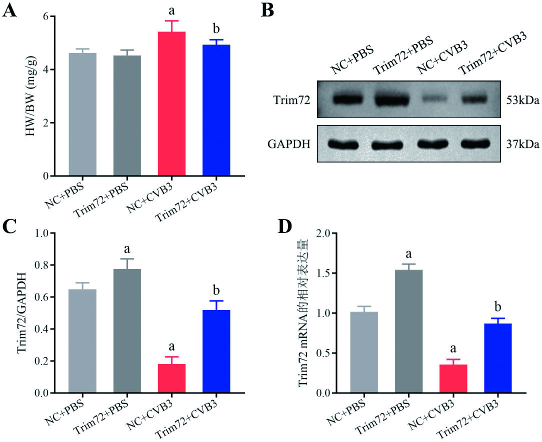 1.3 分组及干预措施40只小鼠按照随机数字表法分为4组(n=10):阴性对照(negative control, NC)+磷酸缓冲盐溶液(phosphate-buffered saline, PBS)组(NC+PBS组)、过表达Trim72+PBS组(Trim72+PBS组)、NC+CVB3组和Trim72+CVB3组。造模前14 d,各组小鼠分别经尾静脉注射阴性对照或过表达Trim72的AAV9(5×1011 VG/只),后CVB3组经腹腔注射含CVB3(2.0×105 PFU/只)的PBS 200 μL构建AVMC小鼠模型,而PBS组小鼠经腹腔注射等量的PBS。观察各组小鼠的一般状况,7 d后2%异氟烷深度麻醉下行眼眶采血收集血液样本,后颈椎脱臼法处死小鼠,无菌留取心脏,并计算心脏重量/体重(heart weight/body weight, HW/BW)比值。本研究严格遵守《中华人民共和国实验动物管理条例》,实验方案由福建医科大学动物实验伦理委员会审核并批准(许可证号:IACUC FJMU 2022-0714)。