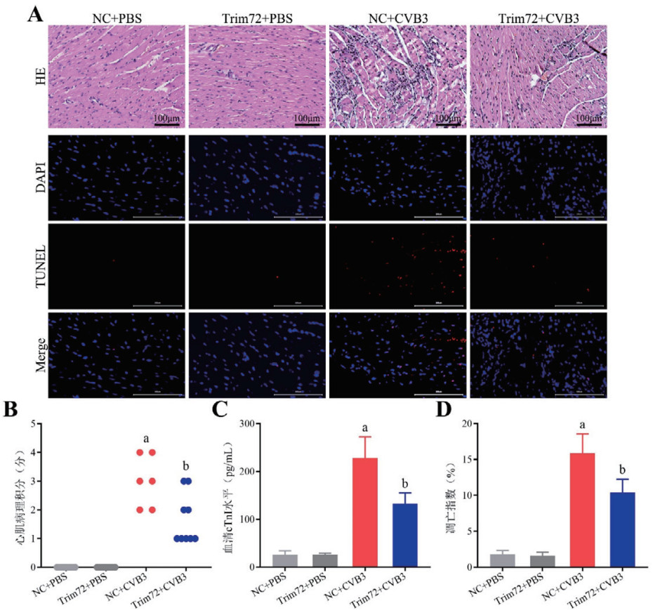 急性病毒性心肌炎(acute viral myocarditis, AVMC)是由病毒感染引起的局灶性或弥漫性心肌炎性疾病,是导致年轻人心力衰竭和猝死的常见原因[1]。柯萨奇B3病毒(Coxsackievirus B3, CVB3)是AVMC的主要致病因子,通过直接侵犯心肌细胞及后续过度激活的免疫反应引起心肌损伤[2]。心肌细胞大量死亡是导致心功能恶化的重要原因,虽然抗病毒药物、免疫抑制剂和循环支持可以一定程度上挽救重症AVMC患者,但目前仍没有公认的特异性治疗方法[3-4]。因此,探索新的干预靶点至关重要。三基序蛋白72(tripartite motif-containing protein 72, Trim72, 也称为MG53)是Trim家族蛋白中的一员,具有特定的结构域,包括环状、B-box和盘状线圈分子以及羧基末端的SPRY片段[5]。作为一种细胞膜修复蛋白,它在骨骼肌和心肌中表达丰富,参与多种病理及生理过程,包括急性细胞膜修复、细胞内的囊泡转运和心脏缺血预适应等,是心肌损伤过程中的关键调节因子[6]。近年来的研究显示,Trim72基因缺失会增加心肌对缺血-再灌注损伤的易感性,而补充重组人Trim72对心肌缺血-再灌注损伤有保护作用[7-8]。本课题组前期通过高通量测序,发现它在AVMC小鼠心肌中显著低表达,然而其具体的作用尚不清楚[9]。本研究拟通过构建CVB3诱导的AVMC小鼠模型,探讨Trim72对AVMC小鼠的作用及可能的机制。