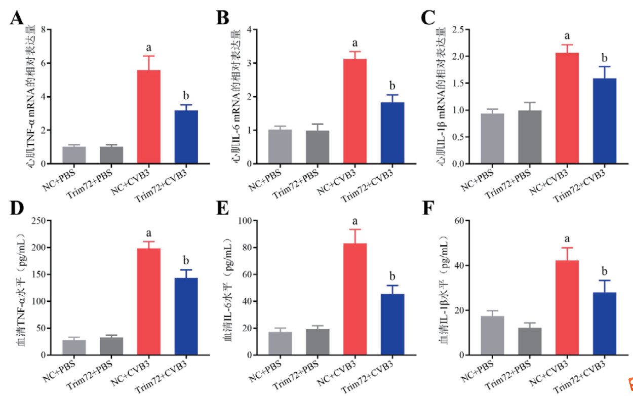 进一步评估过表达Trim72对体内促炎细胞因子表达的影响。如图 3A~C所示,与NC+PBS组相比,NC+CVB3组的心肌TNF-α、IL-6和IL-1β的mRNA相对表达量均明显升高(P < 0.05),而Trim72+CVB3组这些促炎细胞因子的表达量较NC+CVB3组显著降低(P < 0.05)。同样,NC+CVB3组血清TNF-α、IL-6和IL-1β的蛋白水平均显著高于NC+PBS组(P < 0.05),过表达Trim72可以减少血清中这些促炎细胞因子的蛋白水平(P < 0.05)。NC+PBS组和Trim72+PBS组中TNF-α、IL-6和IL-1β的表达差异均无统计学意义(P > 0.05,图 3D~F)。
