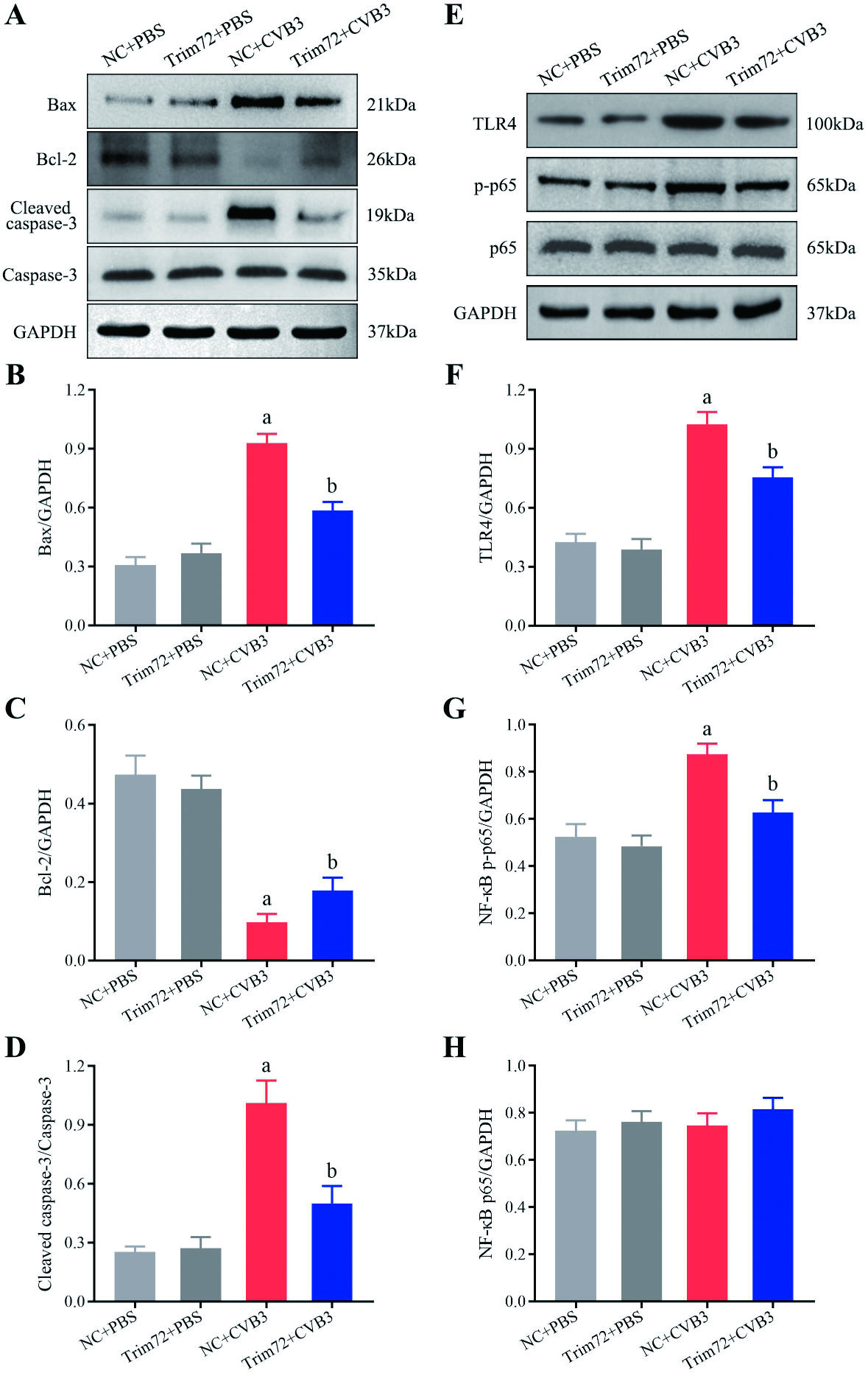 如图 4A~D所示,NC+CVB3组的Bax和Cleaved caspase-3/Caspase-3的表达明显高于NC+PBS组,而Trim72+CVB3组这些蛋白的表达较NC+CVB3组明显降低(P < 0.05);相反,NC+CVB3组Bcl-2的表达明显低于NC+PBS组,而Trim72+CVB3组中Bcl-2的表达较NC+CVB3组明显升高(P < 0.05)。