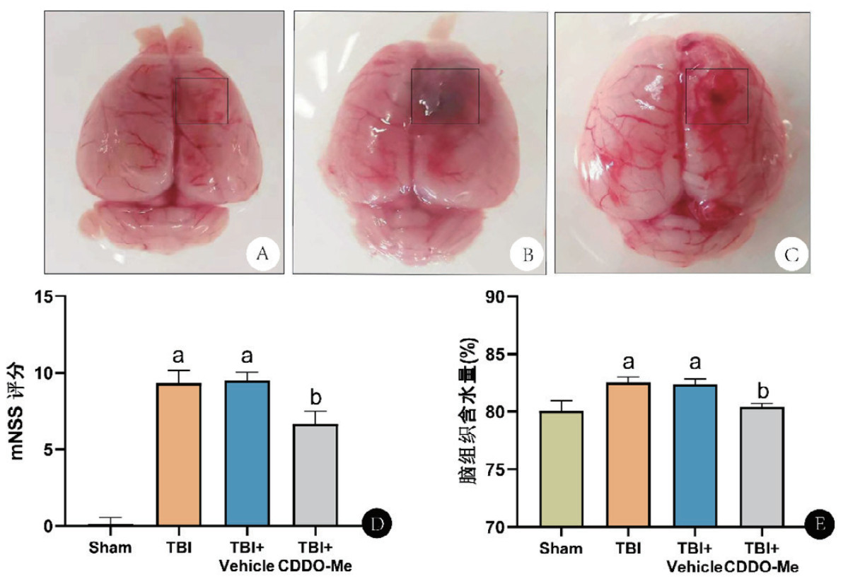 | 注:A~C:依次为Sham组、TBI组、TBI+CDDO-Me组大鼠大脑宏观实物图;D:各组大鼠mNSS评分比较;E:各组大鼠脑组织含水量比较。与Sham组比较,aP < 0.05;与TBI组比较,bP < 0.05 图 1 各组大鼠mNSS评分及脑组织含水量测定 Fig 1 mNSS scores and determination of brain tissue water content in each group of rats |