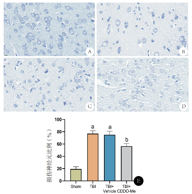| 注:A~D:依次为Sham组、TBI组、TBI+ Vehicle组、TBI+CDDO-Me大鼠尼氏染色图片(×100);E:各组大鼠损伤神经元比例比较。与Sham组比较,aP < 0.05;与TBI组比较,bP < 0.05 图 2 各组大鼠尼氏染色结果 Fig 2 Nissl staining results of each group of rats |