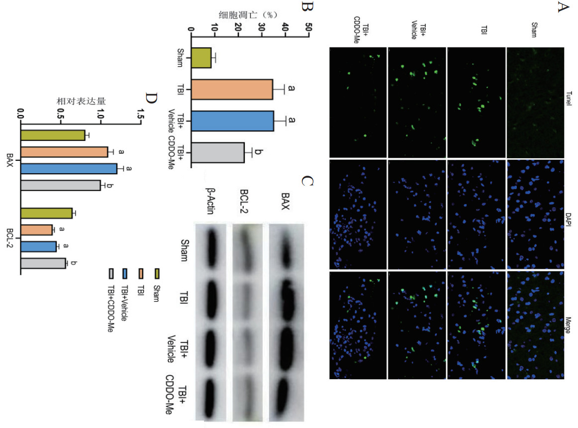 与Sham组比较,TBI组Tunel阳性细胞比例明显升高(P < 0.05)。与TBI组比较,TBI+Vehicle组差异无统计学意义(P > 0.05)。与TBI+Vehicle组比较,TBI+CDDO-Me组Tunel阳性细胞明显下降(P < 0.05)。见图 3A~3B。