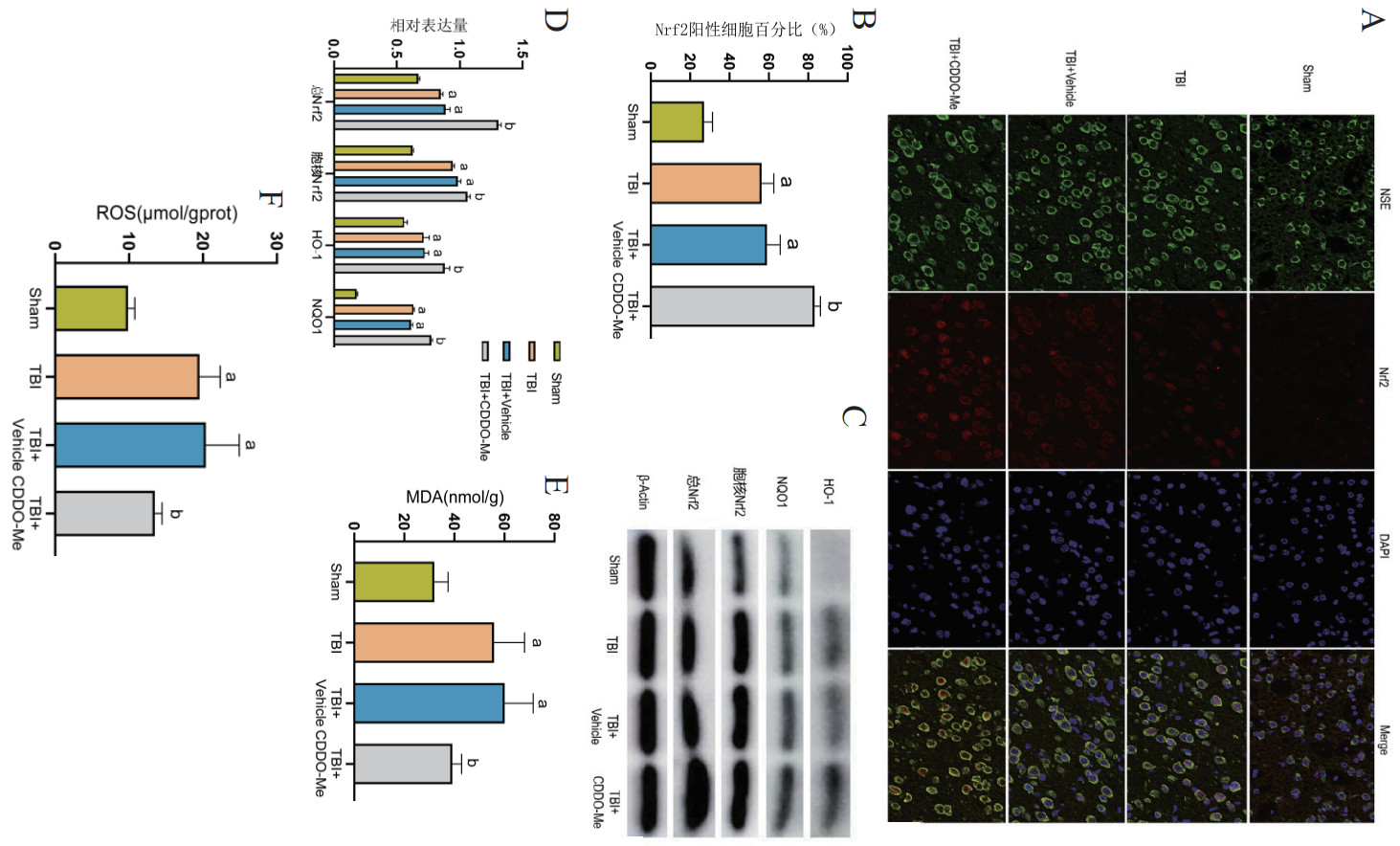 与Sham组比较,TBI组伤侧脑组织中MDA、ROS含量均明显增多(P < 0.05)。与TBI组比较,TBI+Vehicle组差异无统计学意义(P > 0.05)。与TBI+Vehicle组比较,TBI+CDDO-Me组MDA、ROS含量均明显下降(P < 0.05)。见图 4E~4F。