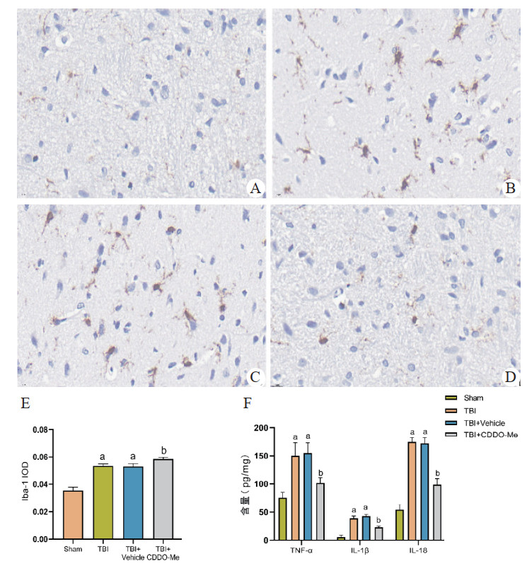 | 注:A~D:依次为Sham组、TBI组、TBI+Vehicle组、TBI+CDDO-Me大鼠Iba-1免疫组织化学染色图片(×100);E:Iba-1染色吸光度比较结果;与Sham组比较,aP < 0.05;与TBI组比较,bP < 0.05 图 5 各组大鼠损伤皮层Iba-1、炎性因子含量比较 Fig 5 Comparison of Iba-1 and inflammatory factor levels in the Injured cortex of each group of rats |