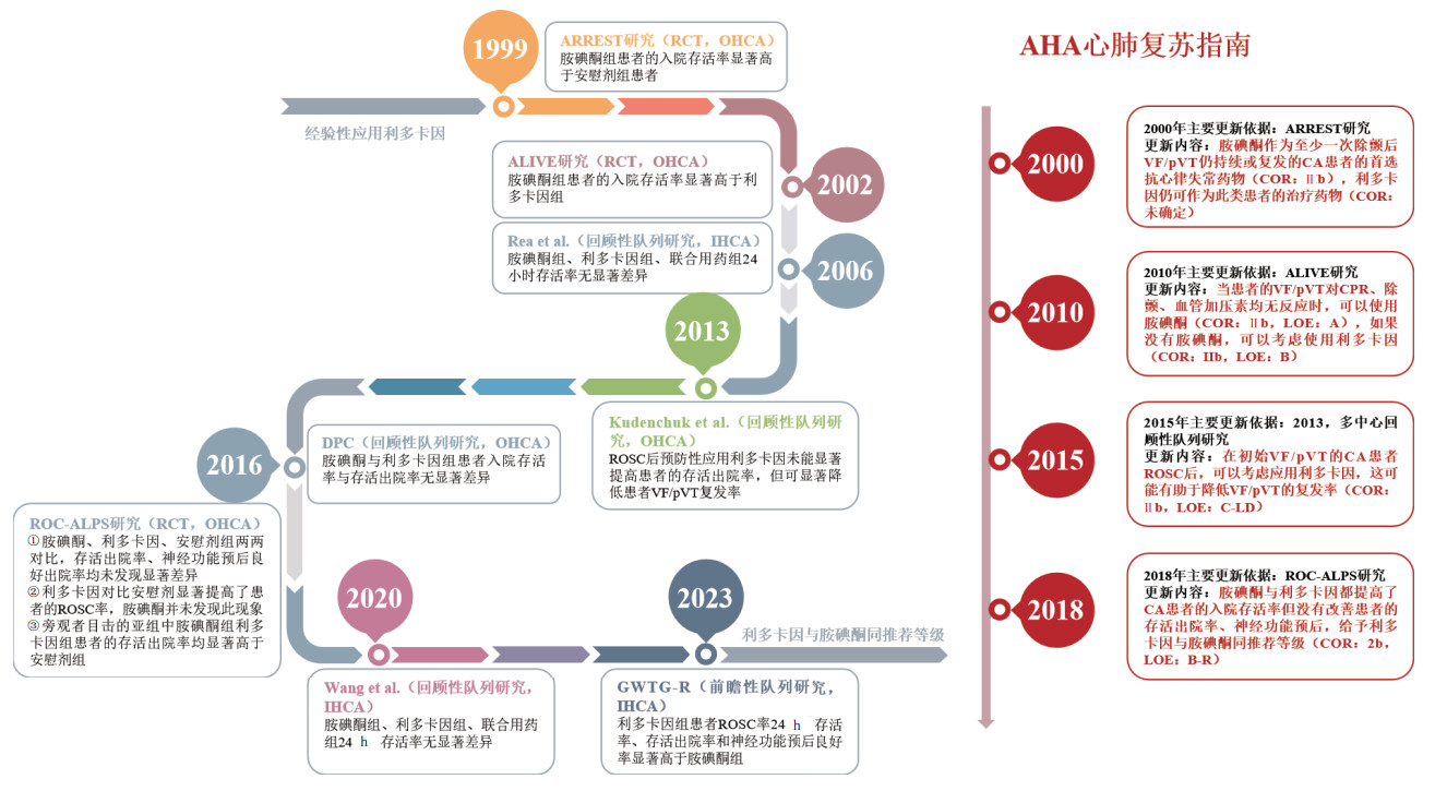 利多卡因是IB类抗心律失常药物,通过轻度阻断Na+通道,促进K+外流缩短动作电位时长,抑制心肌细胞舒张期除极,降低心室肌及传导纤维的自律性及兴奋性,相对地延长有效不应期,发挥抗心律失常作用。胺碘酮是以第Ⅲ类作用为主的广谱抗心律失常药物,它的作用机制较复杂,有非高度选择性阻断钠、钙、钾通道和非竞争性α肾上腺素能受体、β肾上腺素能受体阻断作用,以及对甲状腺功能的复杂影响[7-9]。但两种药物在治疗难治性VF/pVT的CA中哪种更优以及是否可以改善中长期存活和神经功能预后,仍存在较大争议,不利于临床救治工作的有效开展。本文系统梳理了利多卡因与胺碘酮在CA救治中的证据发展以及与之相对应的指南推荐的历史演变(见图 1),以明确研究进展、发现知识缺口,探索进一步的研究方向,寻找改善患者预后的有效方案。