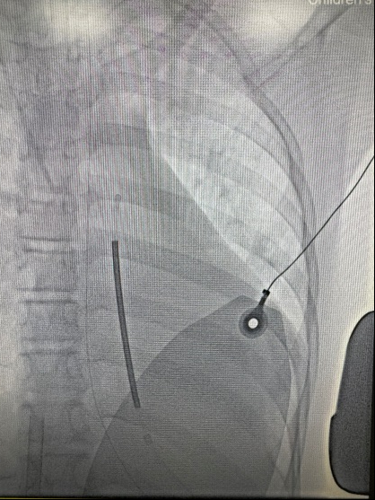 根据年龄、体重不同,婴幼儿VA-ECMO常颈部置管,20 kg以上者可通过股动静脉置管,在ECMO支持下,S-ICD相对TV-ICD更易操作且更安全[22]。VA-ECMO在右房内形成强大负压,从静脉置入导线时,若发生导线误卷或过多气体进入ECMO系统,均可能造成停泵或体循环气体栓塞,而S-ICD埋藏于皮下,避免了此类风险。若患儿存在S-ICD禁忌,需选用TV-ICD时,在置入导线过程中需暂停ECMO。以本例患儿为例,经右股动脉+左股静脉建立VA-ECMO,静脉置管头端在右心房下腔口处,若选择TV-ICD,需经锁骨下静脉进入右心房,将感知环头端送至右心室心尖部,导线远端电极在右室腔内的部分要尽量留长,以便电击时电流较多的覆盖心肌,但在ECMO负压作用下将很难完成,须在送入导线时暂时夹闭ECMO静脉端,以保证导线顺利从右房通过三尖瓣进入右室,并到达目标位置,同时避免导丝误吸。S-ICD整个植入过程则无需停止ECMO,大大降低操作难度,避免术中对心腔内刺激诱发心律失常,甚至血流动力学不稳定的风险。ECMO支持常规使用肝素抗凝,术后需注意手术部位止血。植入成功后可视情况尽早撤离ECMO。