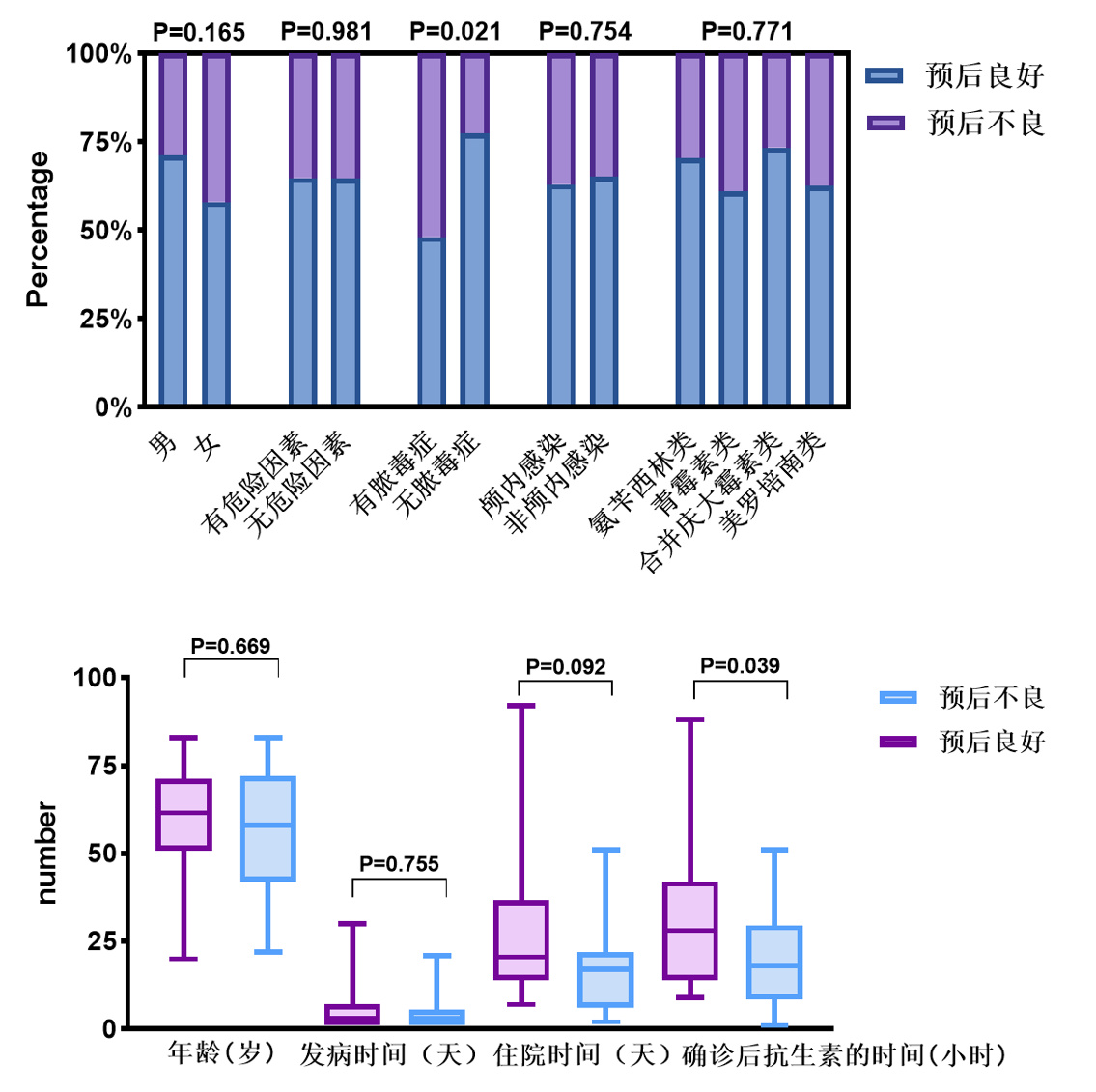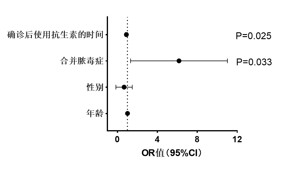 将所有(本院和文献中)患者根据预后情况分为预后良好组和预后不良组,其中预后良好组共66例,预后不良组共36例,预后不良组合并更多的脓毒症患者且确诊后使用抗生素的时间越短,差异具有统计学意义(P<0.05),两组在性别、年龄、危险因素、感染类型、发病及住院时间、抗生素的种类差异无统计学意义,见图 1。Logistics回归分析发现是否合并脓毒症、确诊后抗生素使用的时间是预后不良的独立危险因素(图 2)。