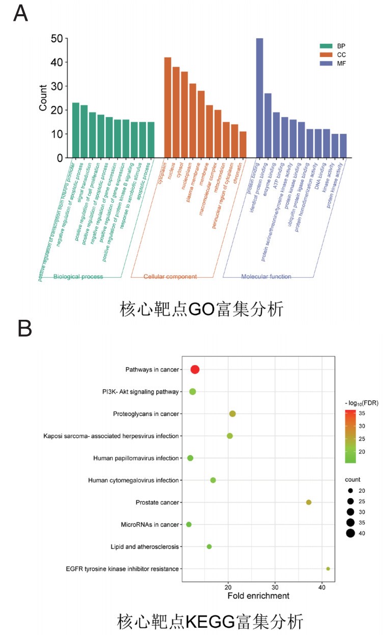GO富集到RNA聚合酶Ⅱ启动子转录正调控、凋亡过程负调控等生物过程285条,细胞质、细胞核等细胞组分32条,蛋白结合、酶结合等分子功能51条,各部分均取“数目”前10的条目绘制柱状图,详见图 1A。KEGG富集到癌症通路、PI3K-AKT信号传导等通路148条,用数目前10的通路绘制气泡图,见图 1B