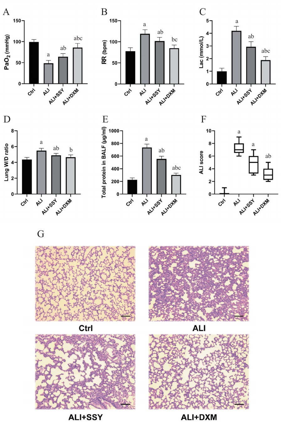 造模24 h后,ALI组大鼠死亡3只,其余3组大鼠均无死亡。Ctrl组大鼠精神正常、活动自如、毛色鲜亮,无明显气喘;ALI组大鼠精神萎靡、活动迟缓、毛色晦暗,气喘明显;ALI+SSY和ALI+DXM组大鼠亦出现精神变差、活动减少、毛色光泽度下降及气喘,但程度均较ALI组大鼠减轻。与Ctrl组相比,ALI、ALI+SSY和ALI+DXM组大鼠的动脉血氧分压(arterial partial pressure of oxygen,PaO2)水平均显著下降(均P < 0.01),且Lac、BALF蛋白浓度和急性肺损伤评分均显著增高(急性肺损伤评分,Ctrl组vs. ALI+DXM组,P < 0.05;余均P < 0.01),ALI和ALI+SSY组的RR和肺W/D比值均显著增高(均P < 0.01),而ALI+DXM组的RR和肺W/D比值虽然均有升高趋势,但差异均无统计学意义(均P > 0.05)。与ALI组相比,ALI+SSY和ALI+DXM组大鼠的PaO2水平均显著升高(均P < 0.01),RR、Lac、肺W/D比值和BALF蛋白浓度均显著下降(均P < 0.01),ALI+DXM组的急性肺损伤评分显著下降(P < 0.01),而ALI+SSY组的急性肺损伤评分有下降趋势,但差异无统计学意义(P > 0.05)。与SSY组相比,ALI+DXM组大鼠的PaO2水平进一步升高,RR、Lac和BALF蛋白浓度均进一步下降,差异均有统计学意义(均P < 0.01),肺W/D比值及急性肺损伤评分均有下降趋势,但差异均无统计学意义(均P > 0.05)。见图 2