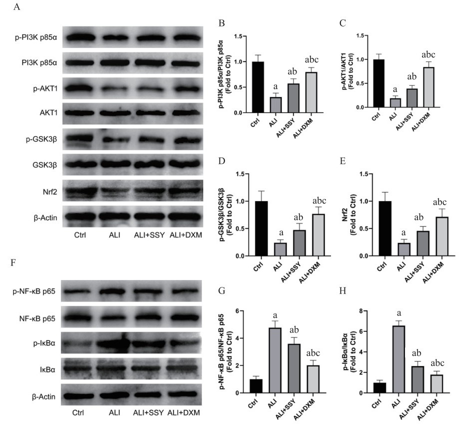 与Ctrl组相比,其余3组大鼠的PI3K p85α、AKT1和GSK3β磷酸化水平以及Nrf2表达水平均显著下降(p-PI3K p85α/PI3K p85α、p-AKT1/AKT1和p-GSK3β/GSK3β,Ctrl组vs. ALI+DXM组,P < 0.05;余均P < 0.01);与ALI组相比,ALI+SSY和ALI+DXM组大鼠的上述指标均显著升高(p-GSK3β/GSK3β和Nrf2,ALI组vs. ALI+SSY组,P < 0.05;余均P < 0.01);与ALI+SSY组相比,ALI+DXM组大鼠的上述指标均进一步显著升高(Nrf2,ALI+SSY组vs. ALI+DXM组,P < 0.05;余均P < 0.01)。ALI、ALI+SSY和ALI+DXM组大鼠的NF-κB p65和IκBα磷酸化水平较Ctrl组均显著升高(p-IκBα/IκBα,Ctrl组vs. ALI+DXM组,P < 0.05;余均P < 0.01);ALI+SSY和ALI+DXM组大鼠的上述指标较ALI组均显著下降(均P < 0.01);ALI+DXM组大鼠的上述指标较ALI+SSY组均进一步下降,差异均有统计学意义(均P < 0.01)。见图 3