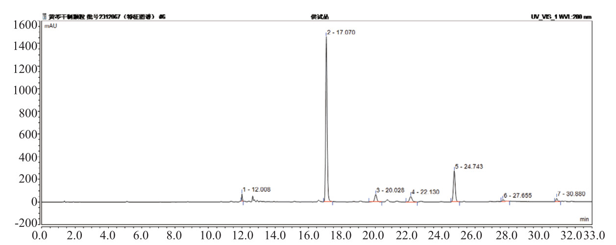 | 图 1 黄芩干制颗粒液相色谱图 Fig 1 biguid chromatography of dried Scutellaria baicalensis granules |