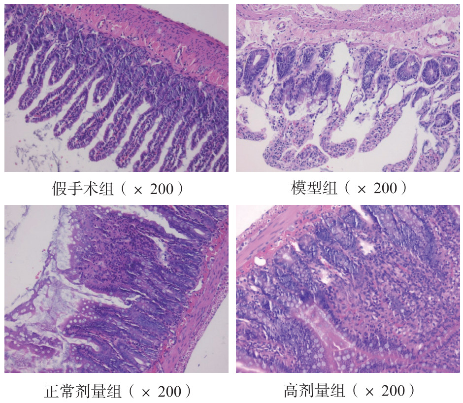 | 图 4 各组大鼠肠组织病理学变化(HE × 200) Fig 4 Histopathological changes in intestinal tissues of rats in each group (HE × 200) |