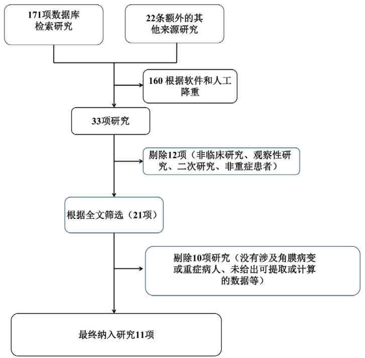 2 结果 2.1 文献检索结果初步检索所得文献171篇,其中Pubmed检索到4篇,Embase检索到140篇,Cochrane Library检索到27篇,通过文章的参考文献部分纳入22篇文章。通过阅读标题和摘要后排除不相关研究和重复研究后剩余160篇研究,剔除非重症患者等符合排除标准的文章12篇,进一步阅读全文排除没有涉及具体干预措施之间的对照实验和未给出可提取或计算的数据等剩余文章10篇文章。最终11篇文献纳入本研究中。文献筛选流程及结果可见图 1。