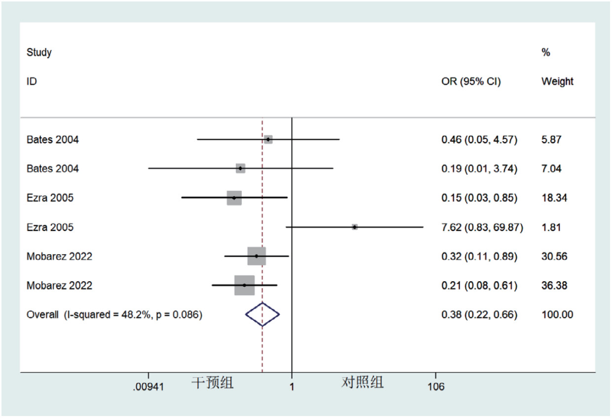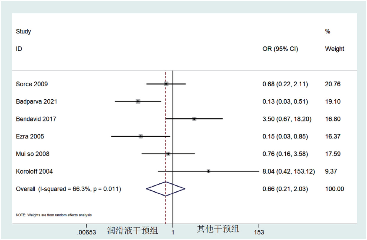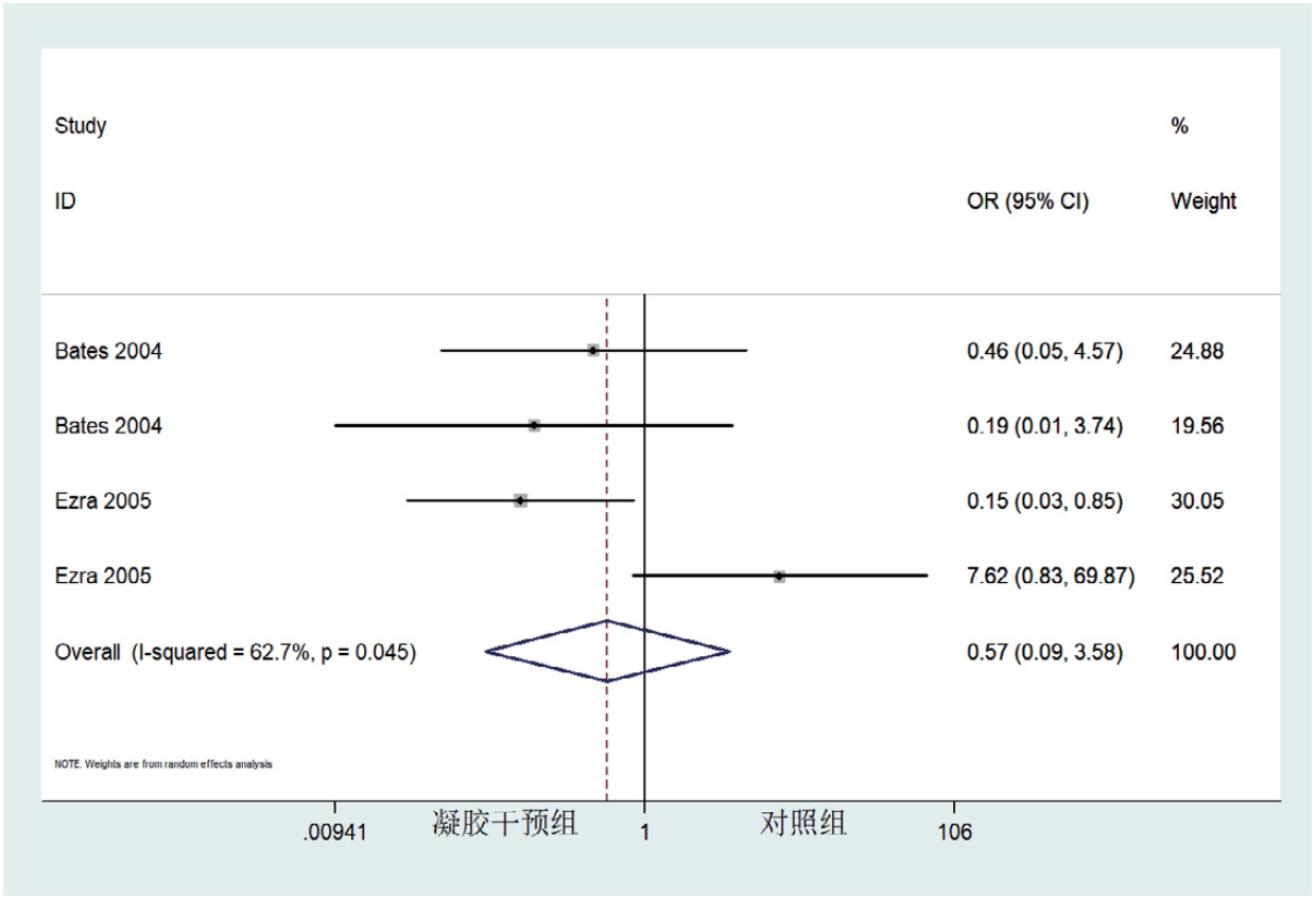 | Mui so 2008[21] | 随机对照研究 | 中国 | 116/57 | 干预组:聚乙烯薄膜;对照组:眼部润滑剂 | 1.45 | 角膜擦伤 |