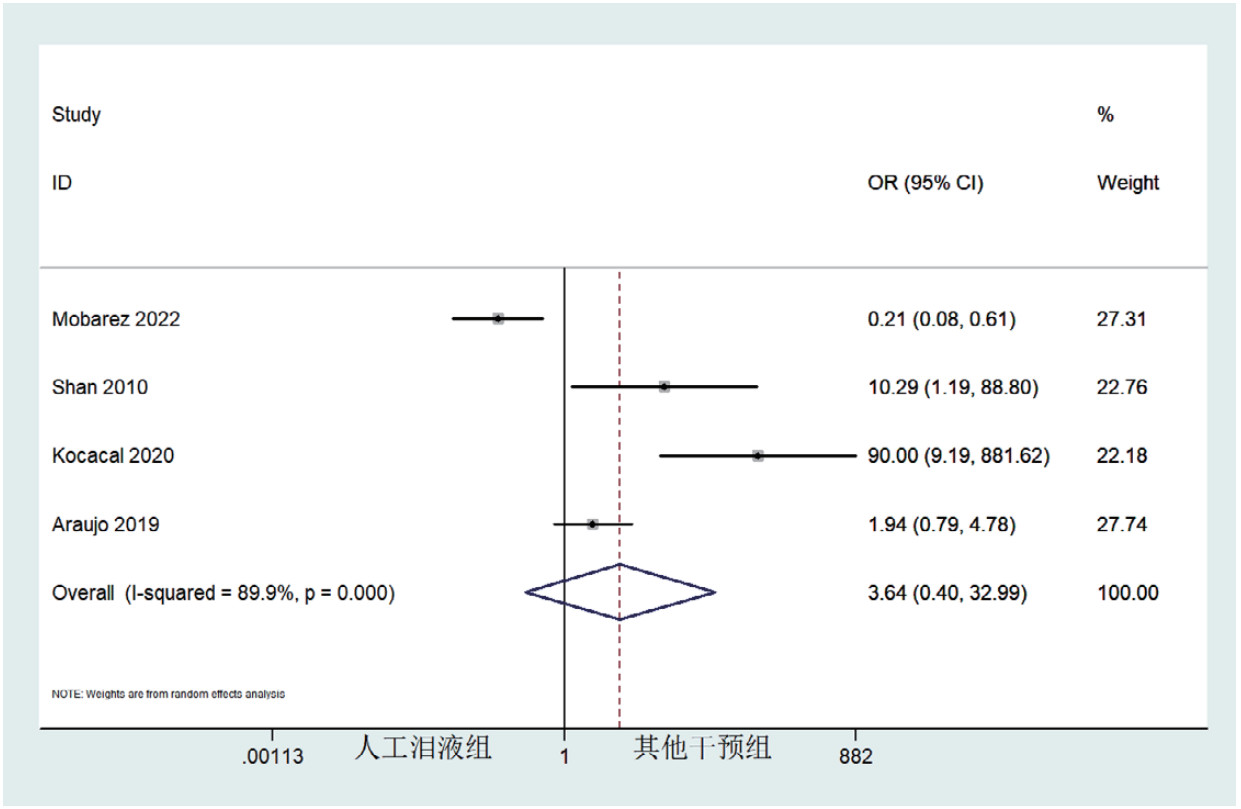 | Bendavid 2017[15] | 随机对照研究 | 以色列 | 104/66 | 干预组1:眼部润滑剂;干预组2:角膜绷带镜;对照组:泪点栓塞 | 1.53 | 角膜病变 |