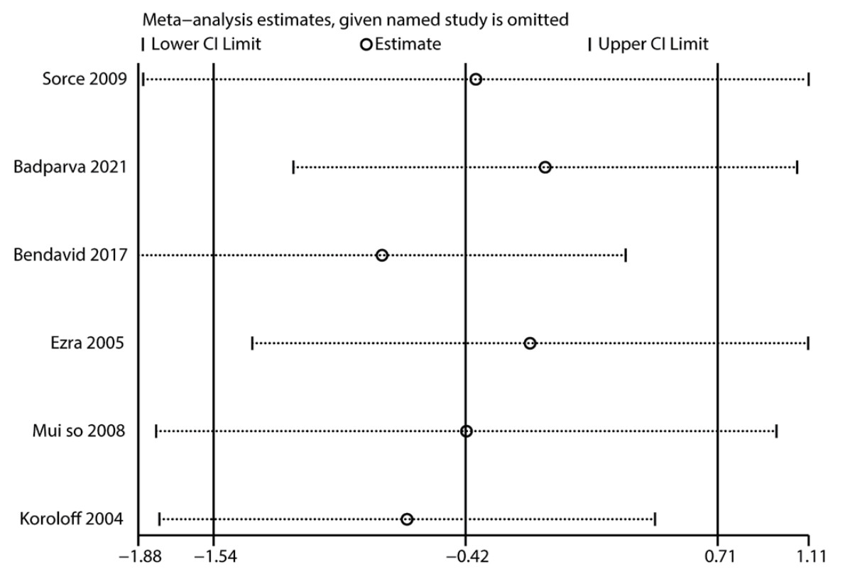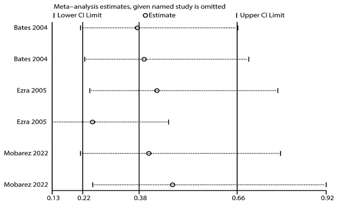纳入的11项研究[11-21]进行逐个剔除单项研究后进行敏感度分析并合并效应量,所有效应量均包含于总的95%CI效应量,表明结果稳定性较好。数据结果如下图所示:(图 8-9)。