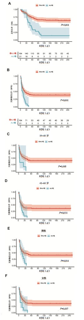 注:A为总体生存情况;B为无脓毒症生存情况:C为年龄亚组(19~40岁);D为年龄亚组(41~60岁);E为性别亚组(男性);F为性别亚组(女性) 图 1 Kaplan-Meier生存法分析ALF组和非ALF组烧伤患者生存情况 Fig 1 Kaplan-Meier survival analysis of severe burn patients with ALF and non-ALF groups