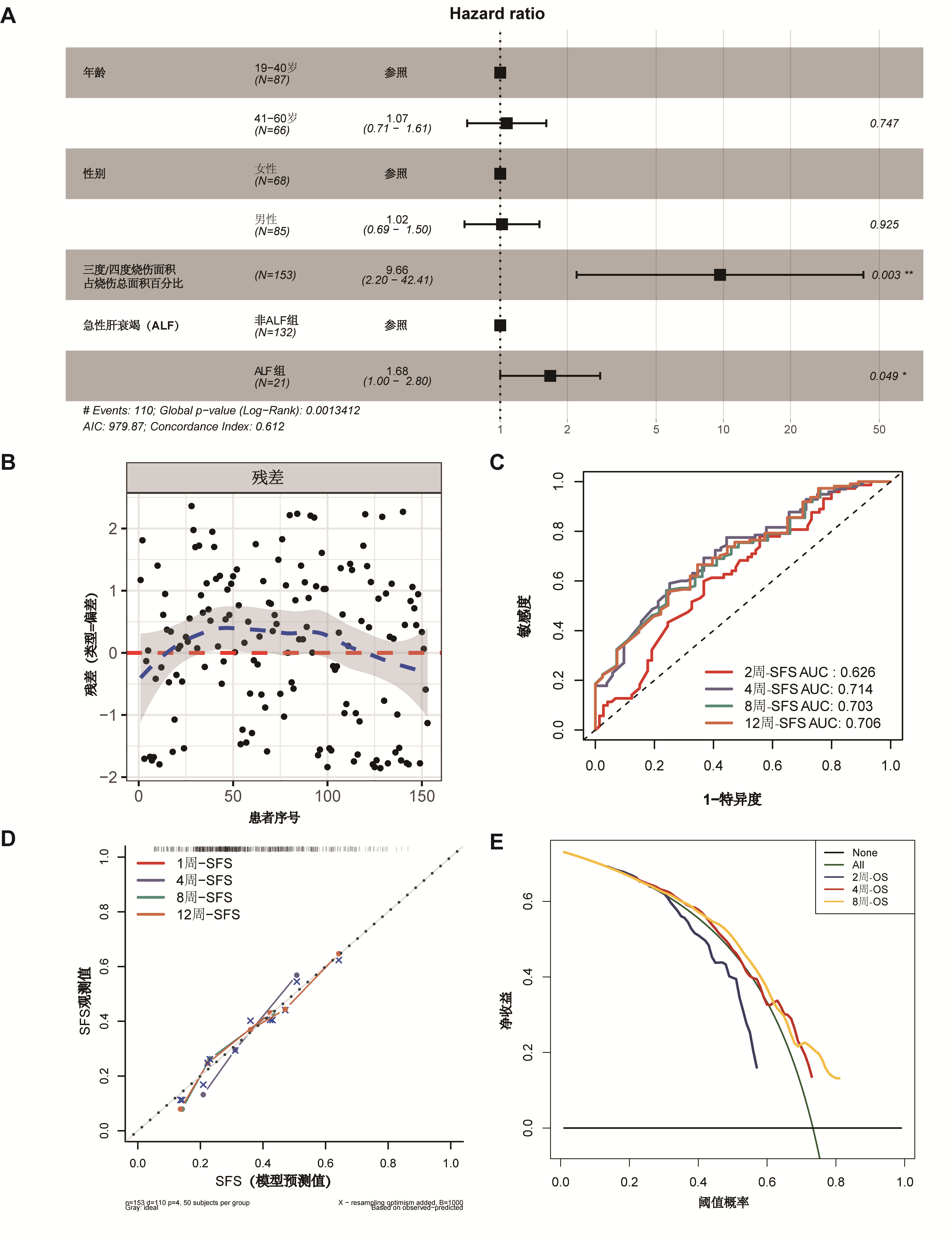 为进一步明确影响烧伤合并ALF患者短期生存的独立危险因素,基于多因素Cox回归分析构建了预后评估模型。最终纳入模型的变量包括年龄、性别、是否发生ALF及三/四度烧伤面积比例(图 2A)。模型具有统计学意义(全局log-rank检验P=0.001),其AIC值为979.87,C-index为0.612,提示模型具有中等判别能力。模型显示,ALF组脓毒症不良预后结局的风险显著高于非ALF组(HR=1.68, 95%CI: 1.00~2.80, P<0.05),提示其为SFS失败的独立预测因子。