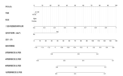为进一步提升模型的临床可操作性,在多因素Cox回归的基础上构建了列线图预测工具(图 3),实现对烧伤患者2~12周脓毒症发生风险的可视化评估。该列线图集成了各项独立预测变量(包括ALF)所赋权重,便于临床医生根据个体特征快速计算脓毒症发生概率,实现更精准的风险分层管理与个体化干预决策。