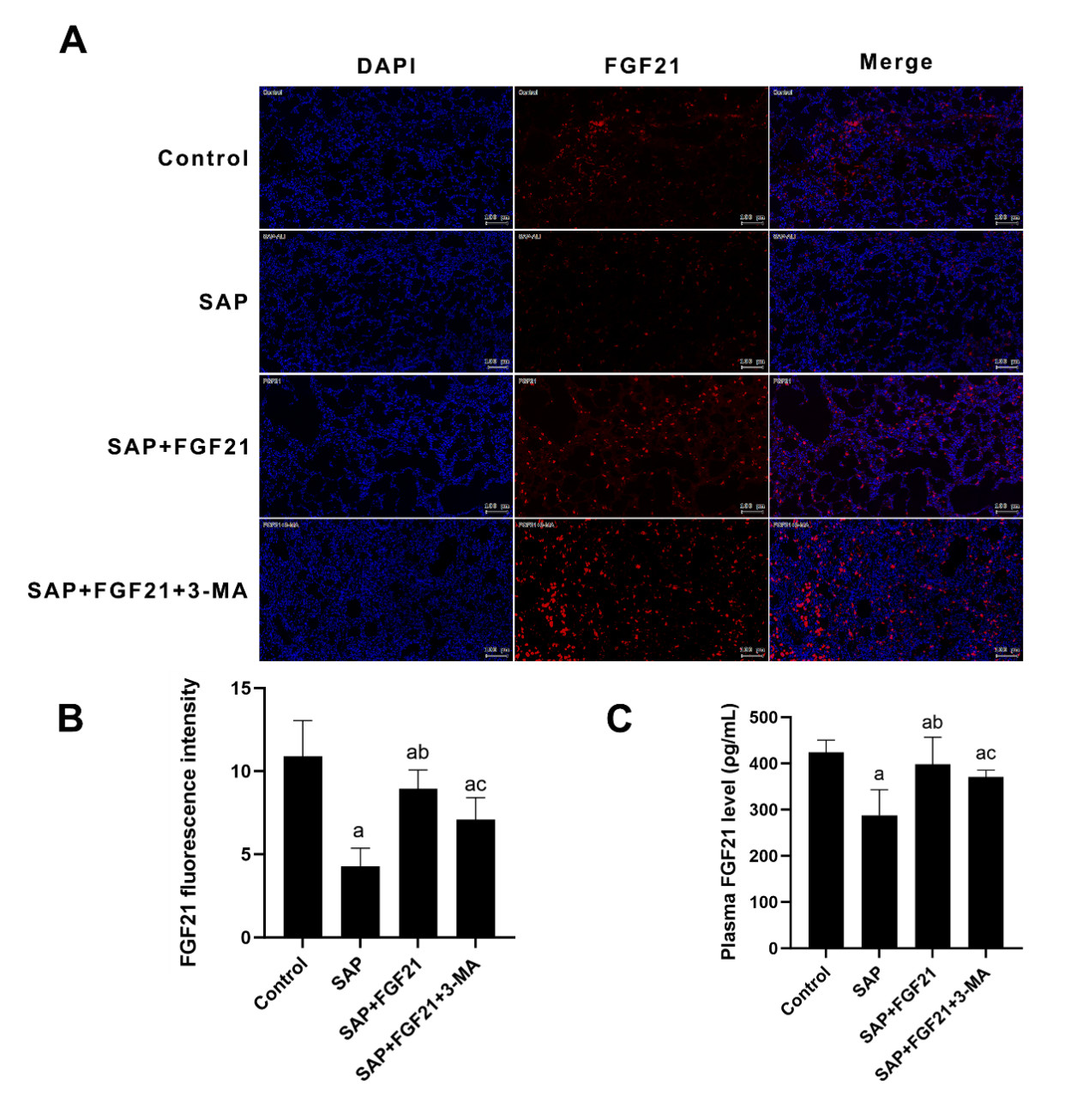 注:A为免疫荧光染色检测大鼠肺组织FGF21表达水平(×200倍,比例尺100 μm);B为FGF21免疫荧光定量分析;C为各组大鼠血浆FGF21水平比较;SAP组与Control组相比,aP<0.001;SAP+FGF21组与SAP组相比,bP<0.01;SAP+FGF21+3-MA组肺与SAP组相比,cP<0.05 图 1 各组大鼠血浆和肺组织FGF21表达水平 Fig 1 FGF21 expression levels in plasma and lung tissue of rats in each group