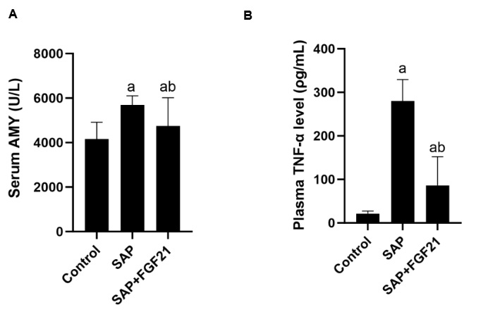 注:A为各组大鼠血清AMY水平;B为各组大鼠血浆TNF-α水平;SAP组与Control组相比,aP<0.001;SAP+FGF21组与SAP组相比,bP<0.01 图 3 FGF21对大鼠血清AMY活性及血浆TNF-α水平的影响 Fig 3 Effects of FGF21 on serum AMY activity and plasma TNF-α levels in rats