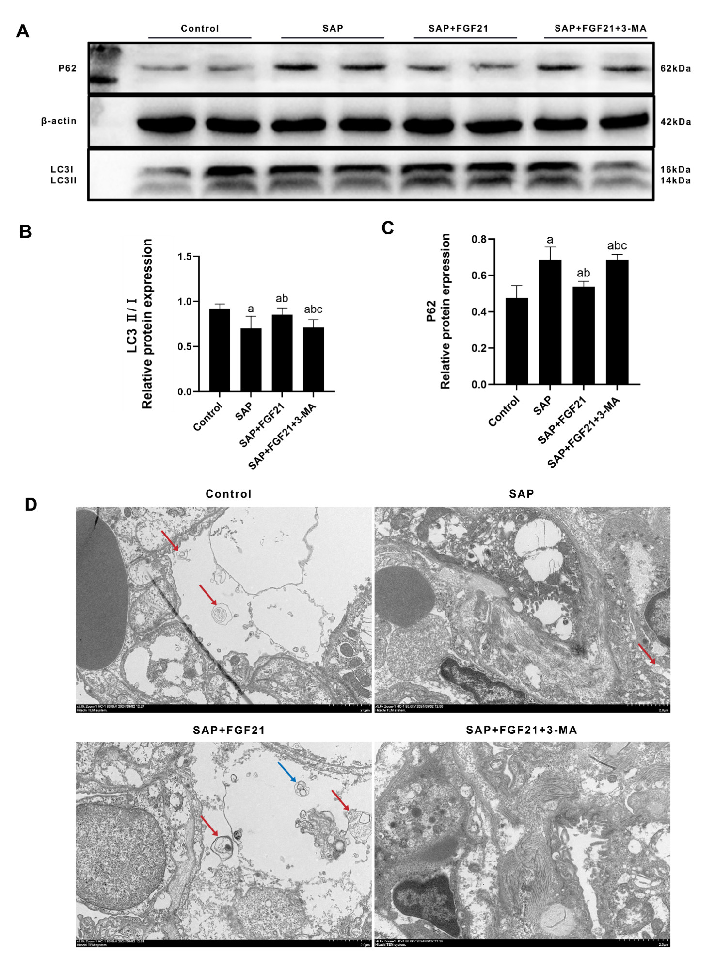 注:A为Western Blot检测自噬相关蛋白水平;B为LC3Ⅱ/Ⅰ定量分析;C为P62定量分析;D为透射电镜下各组大鼠肺组织表现(红色箭头为自噬小体,蓝色箭头为自噬溶酶体);SAP组与Control组相比,aP<0.001;SAP+FGF21组SAP组相比,bP<0.01;SAP+FGF21+3-MA组与SAP+FGF21组相比,cP<0.05 图 4 FGF21对大鼠肺组织自噬水平的影响。 Fig 4 Effect of FGF21 on autophagy level in rat lung tissue.