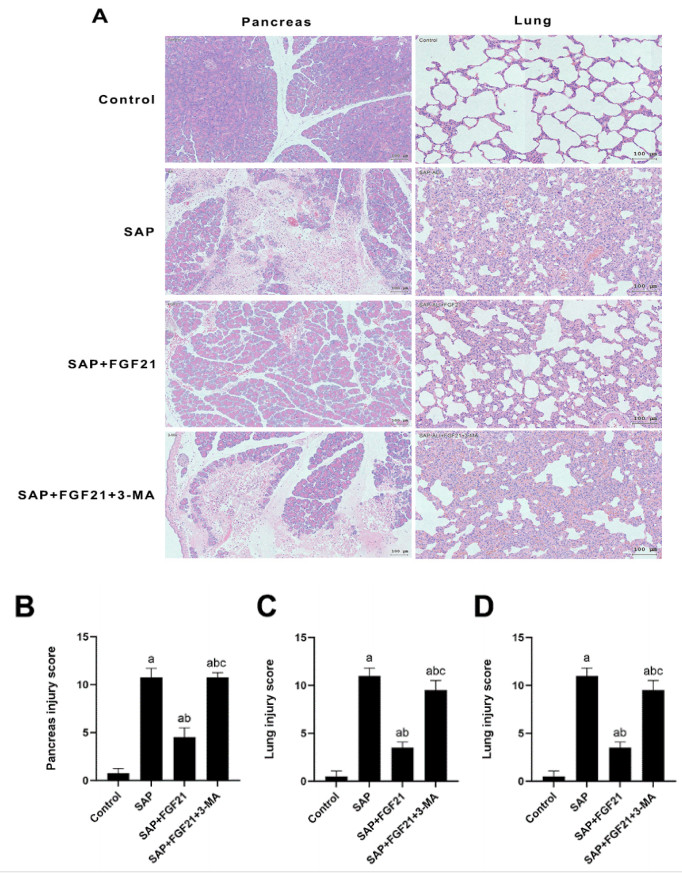 将24只健康、洁净的雄性SD大鼠随机(随机数字法)分为4组:对照组(Control组)、SAP组、FGF21干预组(SAP+FGF21组)、自噬抑制剂组(SAP+FGF21+3-MA组),6只/组。其中,Control组采用主胰管逆行注射生理盐水1 mL/kg后关腹;SAP组沿胃大弯、十二指肠大乳头处4号头皮针向胰胆管内逆行注射3.5% 牛黄胆酸钠1 mL/kg建立模型;SAP+FGF21组在术前1 h腹腔注射FGF21 10 mg/kg;SAP+FGF21+3-MA组在术前1 h分一次腹腔注射FGF21 10 mg/kg、3-MA 20 mg/kg。造模24 h后,腹腔注射5%戊巴比妥50 mg/kg麻醉,右心室采血、处死、采集胰腺及左肺组织。