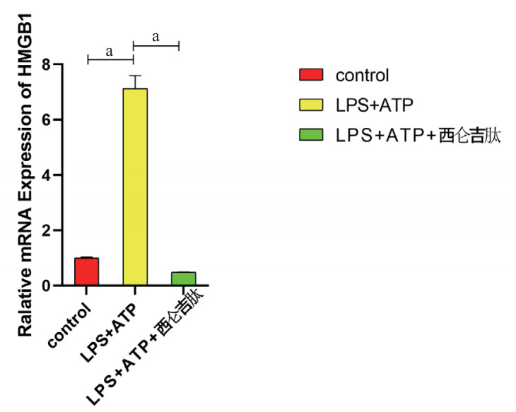 2 结果 2.1 西仑吉肽对LPS和ATP共同诱导巨噬细胞HMGB1 mRNA的表达影响与空白对照组相比,炎症模型组HMGB1 mRNA的表达水平显著升高(P < 0.01);而与炎症模型组相比,西仑吉肽干预组HMGB1 mRNA的表达量显著下降(P < 0.01)(如图 1)。西仑吉肽可以抑制LPS和ATP共同诱导巨噬细胞HMGB1 mRNA的表达。