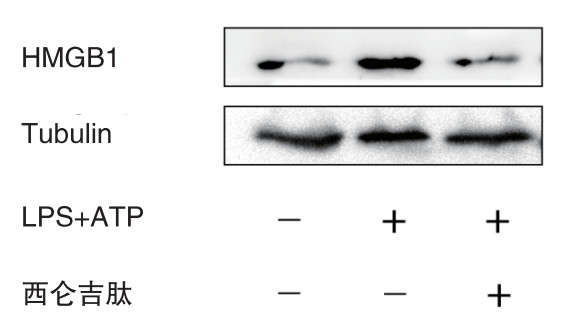 与空白对照组相比,炎症模型组HMGB1的蛋白表达水平增加(P < 0.01);而与炎症模型组相比较,西仑吉肽干预组HMGB1的蛋白表达水平显著下降(P < 0.01)(如图 2)。西仑吉肽可以降低LPS和ATP共同诱导巨噬细胞HMGB1蛋白的表达。