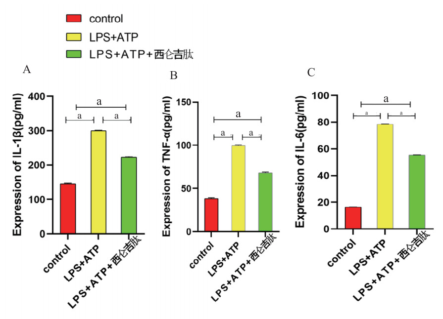 1.4 细胞培养和实验分组巨噬细胞用含10%FBS的DMEM培养基置于37℃、5% CO2细胞培养箱培养,2 d换液或传代。取处于对数生长期的细胞进行分组实验:以106/mL细胞悬浮液铺板于6孔板,置于培养箱中培养12 h后保证细胞贴壁,然后分组予以刺激:①空白对照组:细胞一直予以培养基培养,当炎症模型组开始处理时进行更换新的培养基;②炎症模型组:予以终浓度1 μg/mL的LPS溶液刺激细胞12 h,再加入终浓度5 mmol/l的ATP刺激0.5 h;③西仑吉肽干预组:预先予以终浓度1 μmol/L的西仑吉肽溶液处理细胞24 h,再对细胞同时予以和炎症模型组相同的处理。