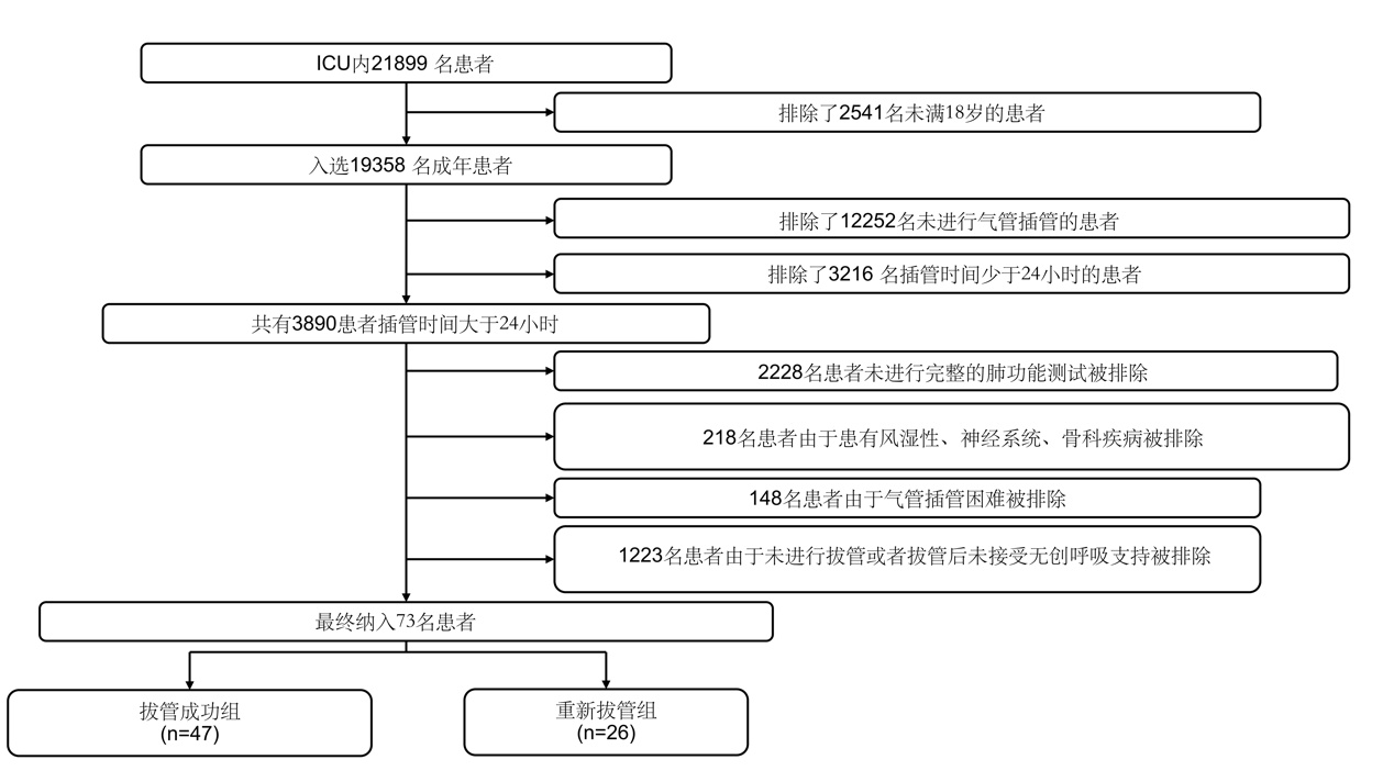 患者的数据是通过医院信息管理系统,从2019年1月至2021年12月在中南大学湘雅三医院的6个重症监护病房(ICU)中回顾性收集的。本研究的资格标准包括:(1)任何原因的插管,使用的呼吸机包括瑞士Hamilton C1、C2和中国Mindray SV600;(2)在气管拔管前完成临床和肺功能测试数据;(3)在拔管前成功完成自主呼吸试验(SBT)[低水平压力支持模式:支持压力选择在5~8 cmH2O之间,氧气分数(FiO2)保持恒定,持续2 h];(4)拔管后使用无创呼吸支持,如双水平鼻正压通气和高流量鼻导管氧疗。排除标准包括:(1)年龄小于18岁;(2)插管时间少于24 h;(3)进入ICU前患有风湿病、神经病或骨科疾病;(4)精神残疾或无法合作;(5)困难的气管插管;(6)临床数据不完整;(7)意识障碍或其他无法配合肺功能测试的情况;(8)因各种原因撤回或不配合临床治疗计划的患者。这项回顾性研究得到了中南大学湘雅三医院伦理审查委员会的支持,审查编号为22076,由于研究的回顾性质,免除了知情同意的要求。