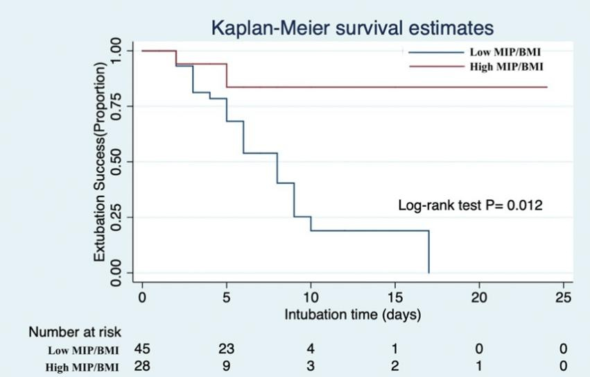 采用ROC曲线进一步确定MIP/BMI的最佳截断值。结果证实MIP/BMI的AUROC为0.753(95%CI: 0.640~0.866),最佳预测值为1.26(敏感度:55.3%,特异度:92.3%)(见图 2)。随后,根据最佳预测值将队列分为低MIP/BMI(MIP/BMI≤1.26)和高MIP/BMI(MIP/BMI>1.26)组。通过Kaplan-Meier方法,发现低MIP/BMI组的再插管率显著高于高MIP/BMI组,尤其是在插管时间延长的情况下(P= 0.012)(见图 3)。