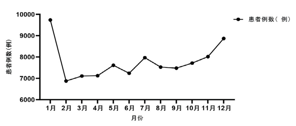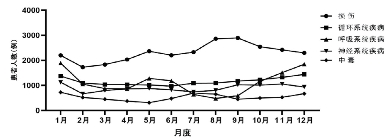 而各疾病的年度、月份分布也各有特点。循环系统疾病与神经系统疾病患者逐年增多。呼吸系统疾病及中毒患者在经历了2019年到2020年的减少后保持稳定,在2023年明显增多。创伤患者则在经历2019年至2022年的增长后于2023年迎来拐点。见表 3。损伤以8月(2 858例)及9月(2 893例)是多见。呼吸道疾病发病高峰为2月(1 438例)。而中毒则呈双峰分布,7月(721例)及1月(692例)患者最多。见图 4