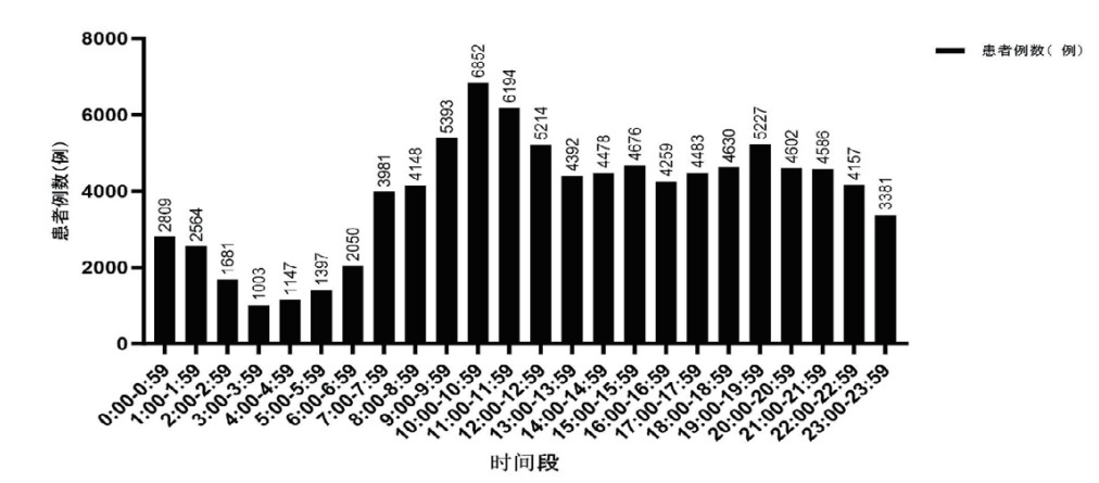 月度分布中,1月份患者最多,达9 737例,其次为12月,患者8871例。见图 2。在每日24 h中,出诊最高峰出现10:00-10:59时段,有6 852例患者,其后为11:00-11:59时段,有6 194例患者,最低谷为03:00-03:59时段,仅1 003例患者。见图 3