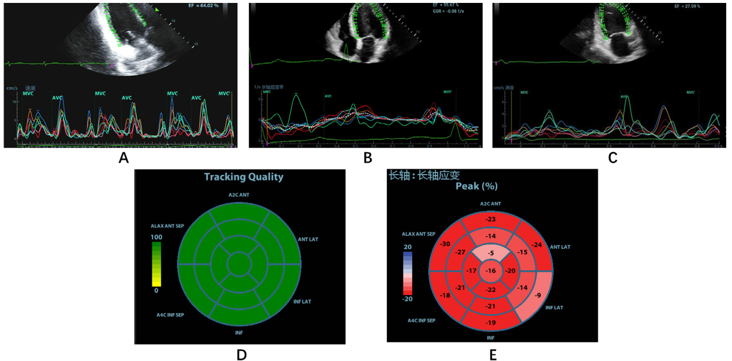 1.2.2 超声心动图检查纳入研究的患者均在发病24 h内行床旁超声心动图检查。采用迈瑞M9彩色多普勒超声诊断仪,应用SP5-1U探头,帧频40~80帧/s。连接心电图,常规超声心动图测量左室射血分数;然后连续采集标准左室长轴,心尖四腔及两腔心切面动态二维图像,存储动态图像并分析左室心肌纵向收缩期峰值应变,上述所有测量值均取3个心动周期平均值。某典型病例测量见图 1。