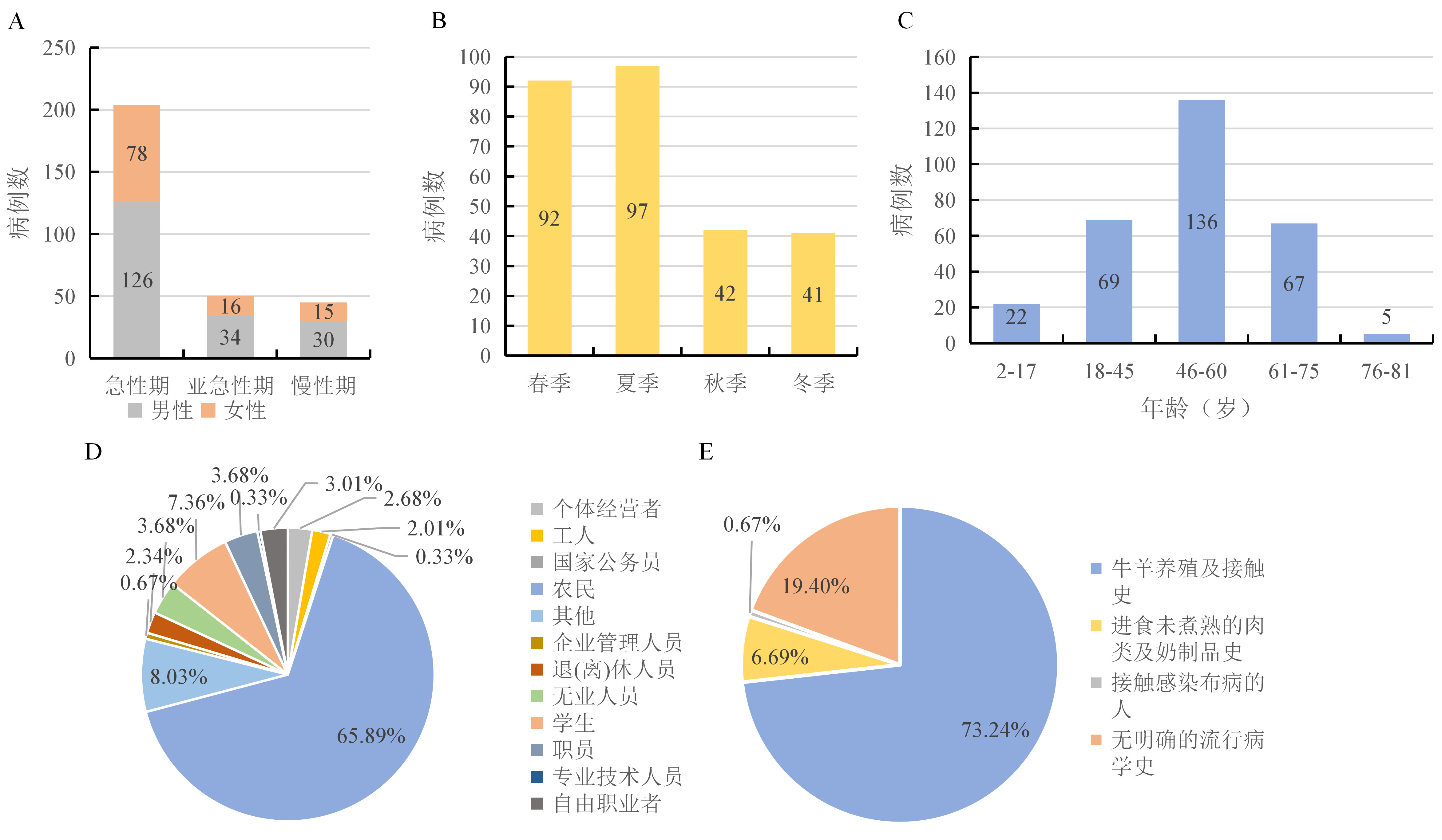 | A:患者不同年龄段分布(n=299);B:不同分期性别分布(n=299);C:患者季节分布(n=272);D:患者职业分布;E:接触史分布 图 1 布病患者总体特征分布 |