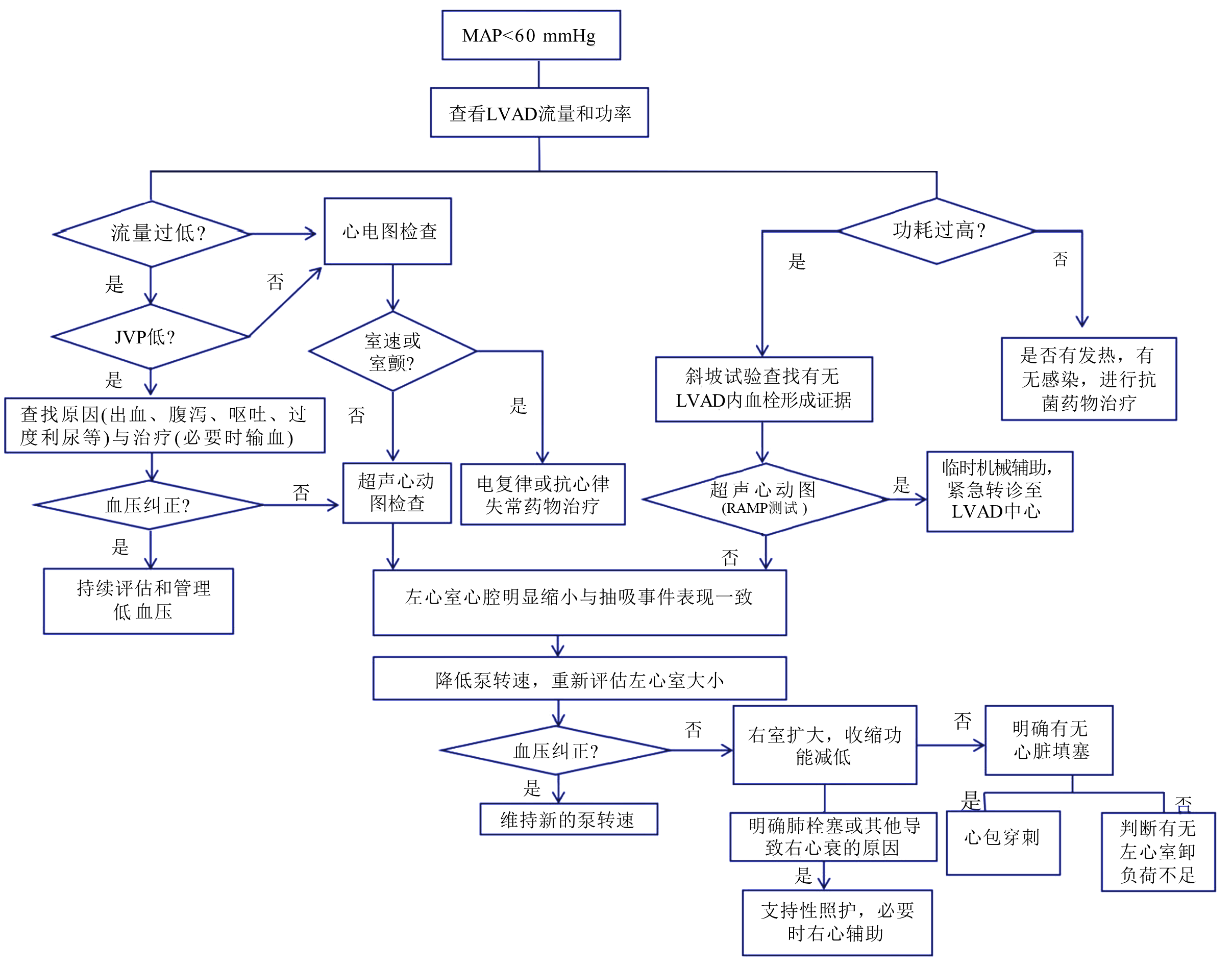 流量过低 可能原因有低血容量、右心衰竭、后负荷过大或泵血栓形成,与LVAD中心联系,查找原因处理,维持MAP在60~80 mmHg